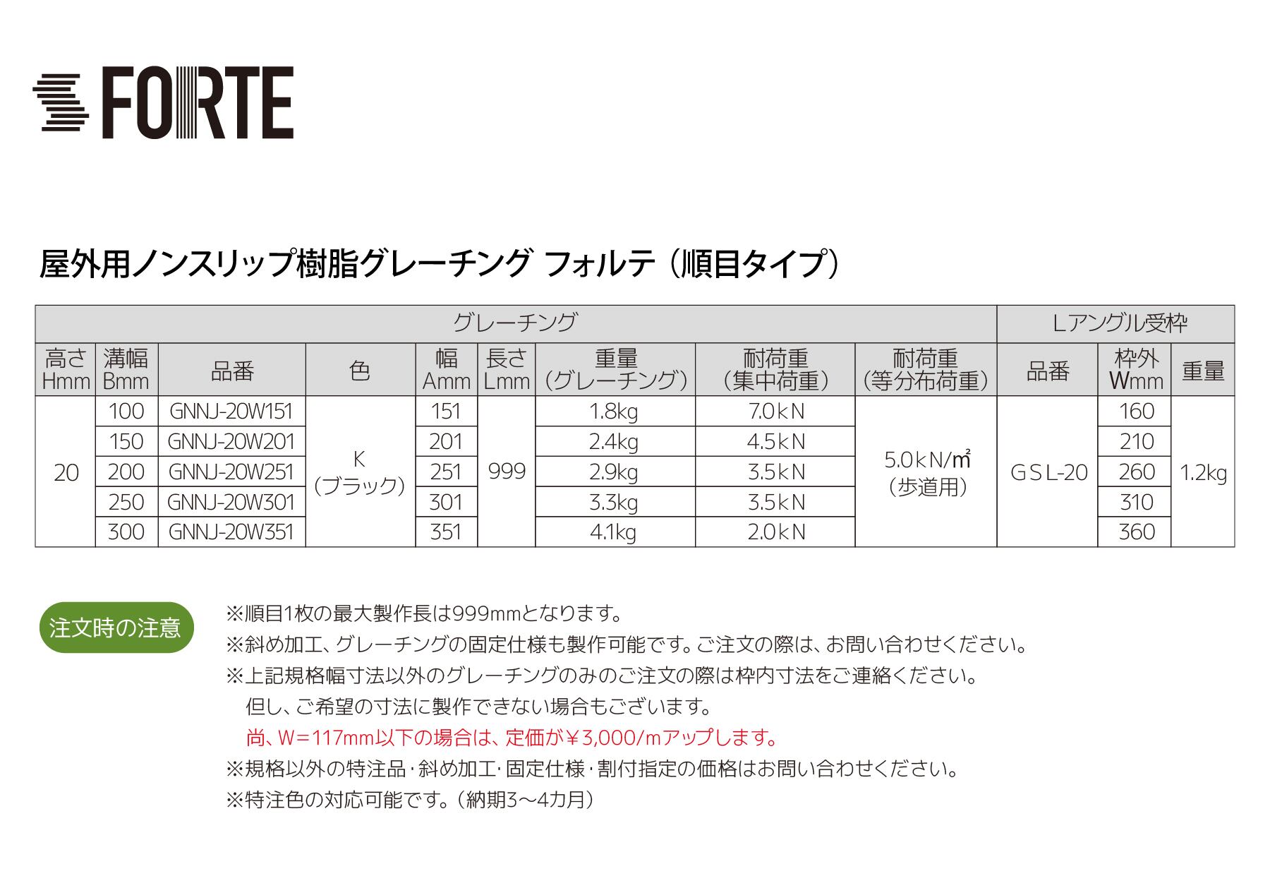 【GNNJ-20W351-K】屋内外兼用ノンスリップ樹脂グレーチング フォルテ(順目仕様) 20×351×999