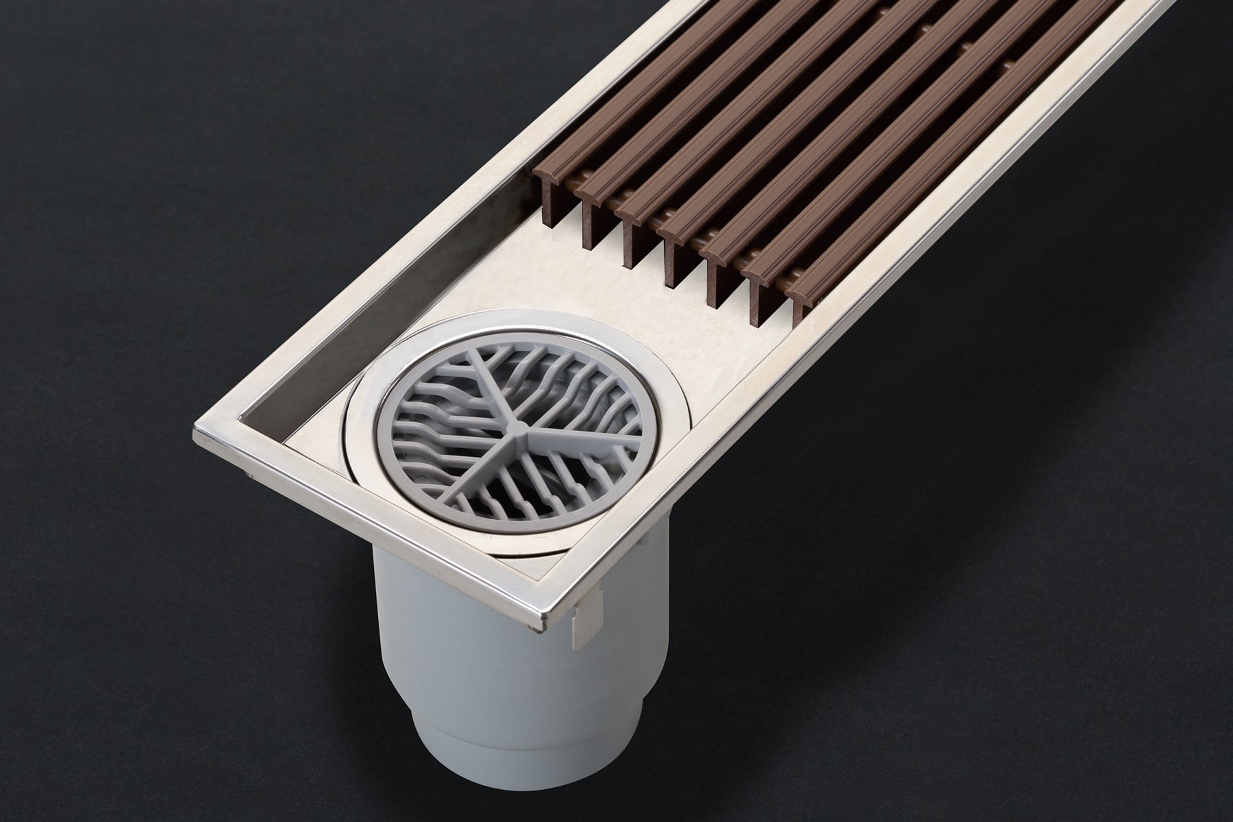 ボックスタイプで樹脂グレーチングは底についているので、車イスなどの重量物が載っても変形しません(耐荷重強度9.0kN)。