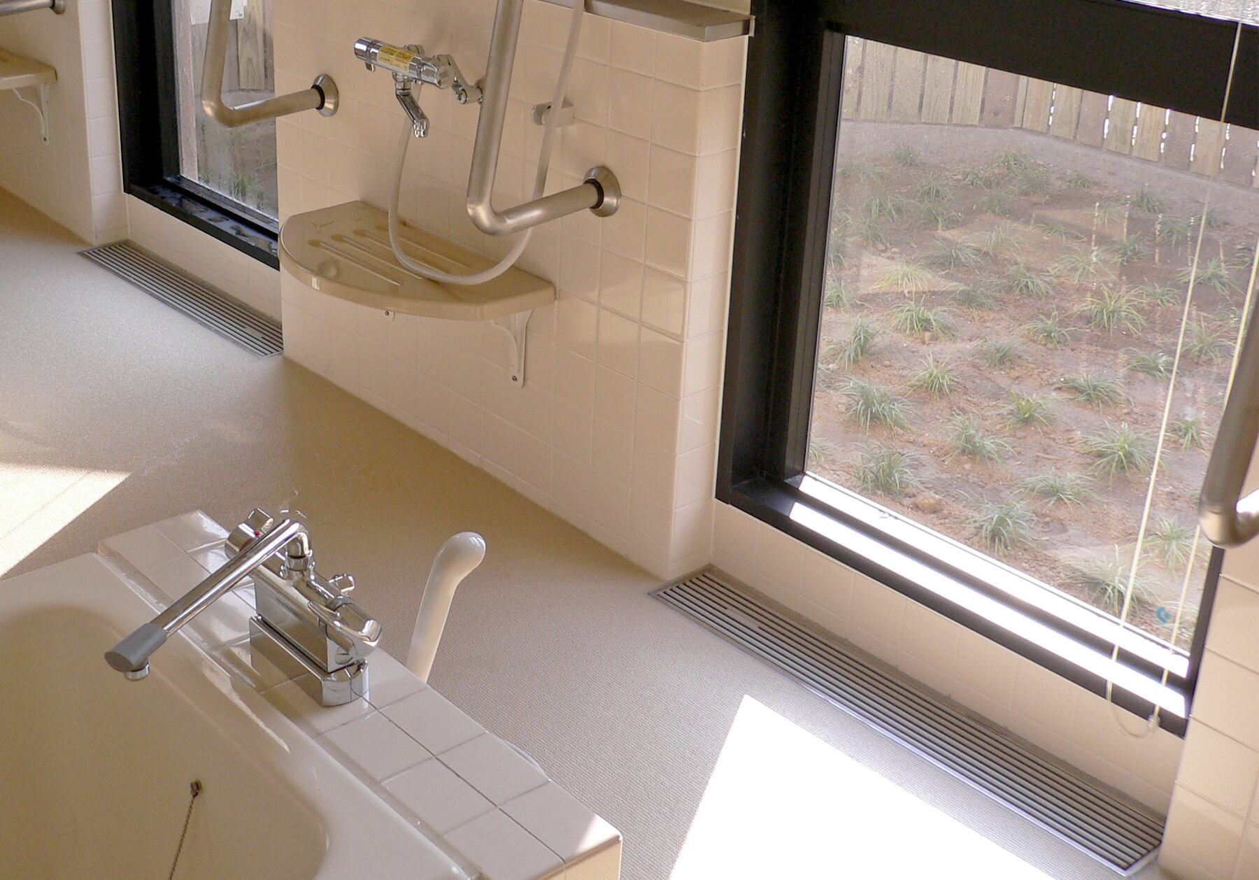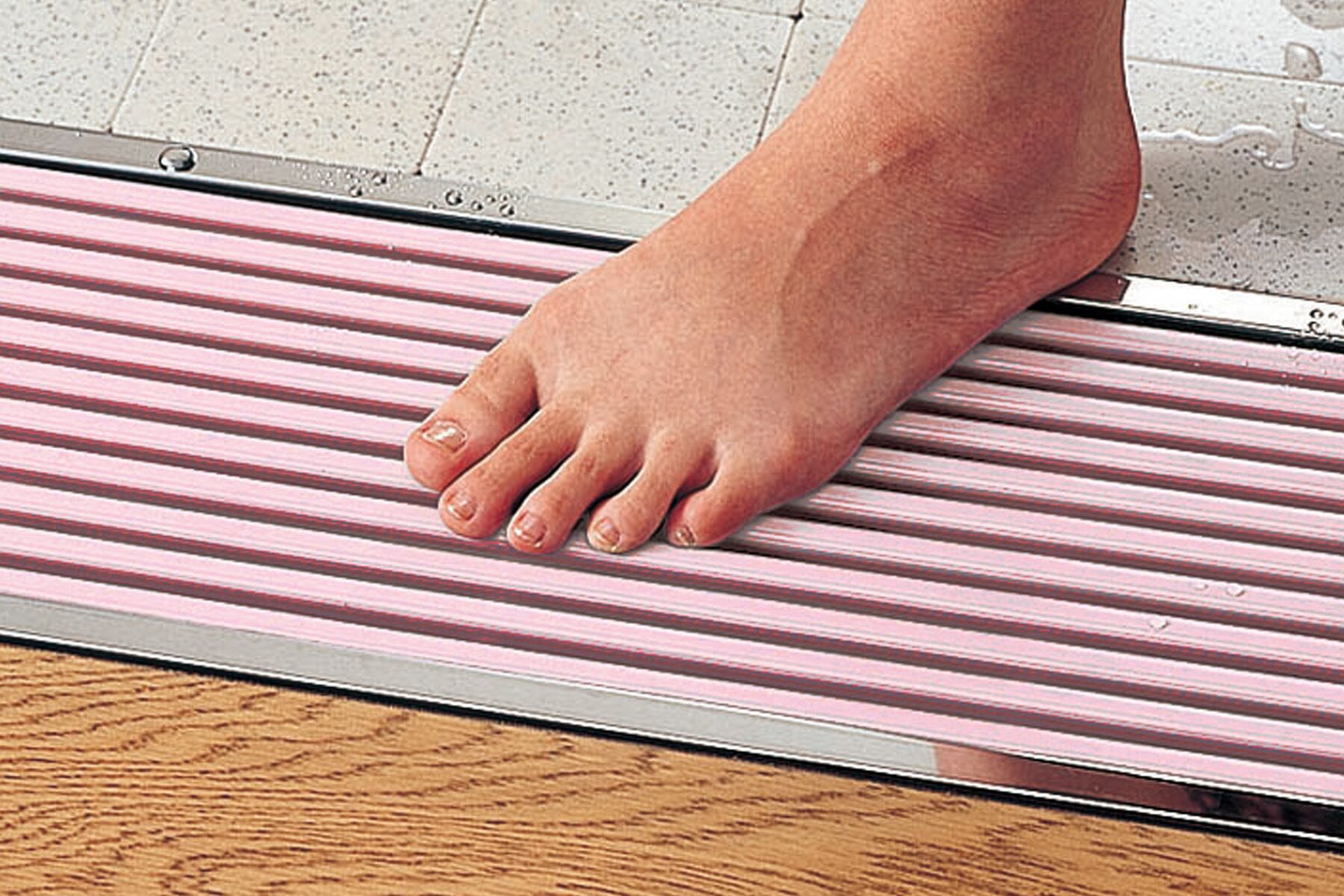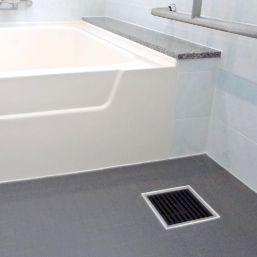 高齢者施設や病院・住宅・マンションなどの浴室やトイレの出入口に最適です。上面はやわらかい軟質樹脂を使用しているので、滑りにくく、冷たくありません。また、踏み心地もよく、素足でも安心。グレーチングは抗菌・防カビ仕様で耐薬品性・耐熱水性にも優れています。 150角タイル用と200角タイル用をご用意していますので、用途に合わせお選びください。